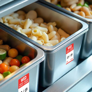 Unverzichtbar in der Lebensmittel- und Gastronomiebranche, wenn es um Hygiene, Qualitätssicherung, Lagerhaltung und Lebensmittelsicherheit geht: eine effiziente und klare Beschriftung mit Tages-Etiketten. Ob Gastronomiebetrieb, Hotel, Bäckerei, Großküche & Kantine, Direktvermarkter auf Wochenmärkten oder Lebensmittelindustrie, die Tages-Etiketten mit Wochentag erleichtern Ihnen und Ihren Mitarbeitern die Nachverfolgung von Verbrauchs-, Herstellungs- oder Öffnungsdaten von Lebensmitteln. Dank eines Farbcodes pro Tag erkennen die Teams auf einen Blick, welche Produkte vorrangig verwendet werden müssen. Dies trägt dazu bei, Lebensmittelabfälle zu reduzieren und eine optimale Rotation der Lebensmittel zu gewährleisten. Die Verwendung von Tages-Etiketten bedeutet eine tägliche Zeitersparnis bei gleichzeitiger Gewährleistung einer einwandfreien Servicequalität im Rahmen des HACCP-Standards und lässt sich perfekt in die Arbeitsabläufe Ihrer Küche oder Produktion integrieren. Die Papier-Etiketten sind einfach und schnell mit jedem beliebigen Stift beschreibbar, einfach Datum und/oder Inhalt aufschreiben. Die Etiketten haften zuverlässig auf den verschiedensten Oberflächen, nach Verwendung können die Etiketten dank des ablösbaren Spezialklebstoffs ohne Rückstände abgezogen werden - ideal zur hygienischen Reinigung. Die jeweilige Wochentag-Beschriftung wird auf Deutsch, Englisch, Französisch, Italienisch und Niederländisch angegeben. Dank der praktischen, stabilen Spenderbox können die Etiketten auf Rolle schnell und einfach entnommen und sauber aufbewahrt werden. Die Tages-Etiketten aus Papier sind für den indirekten Kontakt mit Lebensmitteln geeignet. Die Lebensmittel-Kennzeichnung ist gesetzlich durch die EU-Verordnung (EG) Nr. 852/2004 und der LMHV (Lebensmittelhygieneverordnung) geregelt: Unternehmen und Betriebe, die mit leicht verderblichen Lebensmitteln umgehen oder Lebensmittel herstellen, müssen ein Hygienekonzept (HACCP) umsetzen und dokumentieren. Unsere Tages-Etiketten für Lebensmittel helfen Ihnen, in Ihrem Betrieb die strengen Hygiene- und Qualitätsstandards einzuhalten - und das effizient, klar ersichtlich und ohne großen Aufwand.